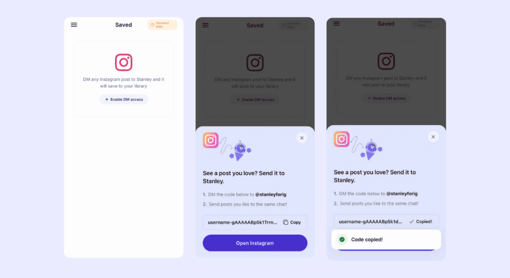 Open your Stanley app, navigate to the left-hand menu, click ‘Saved,’ and select Enable DM Access. Copy your unique connection code, open Instagram, and paste it into a DM to @StanleyForIG. Once you hit send, you’re connected and can start sending Stanley content immediately.